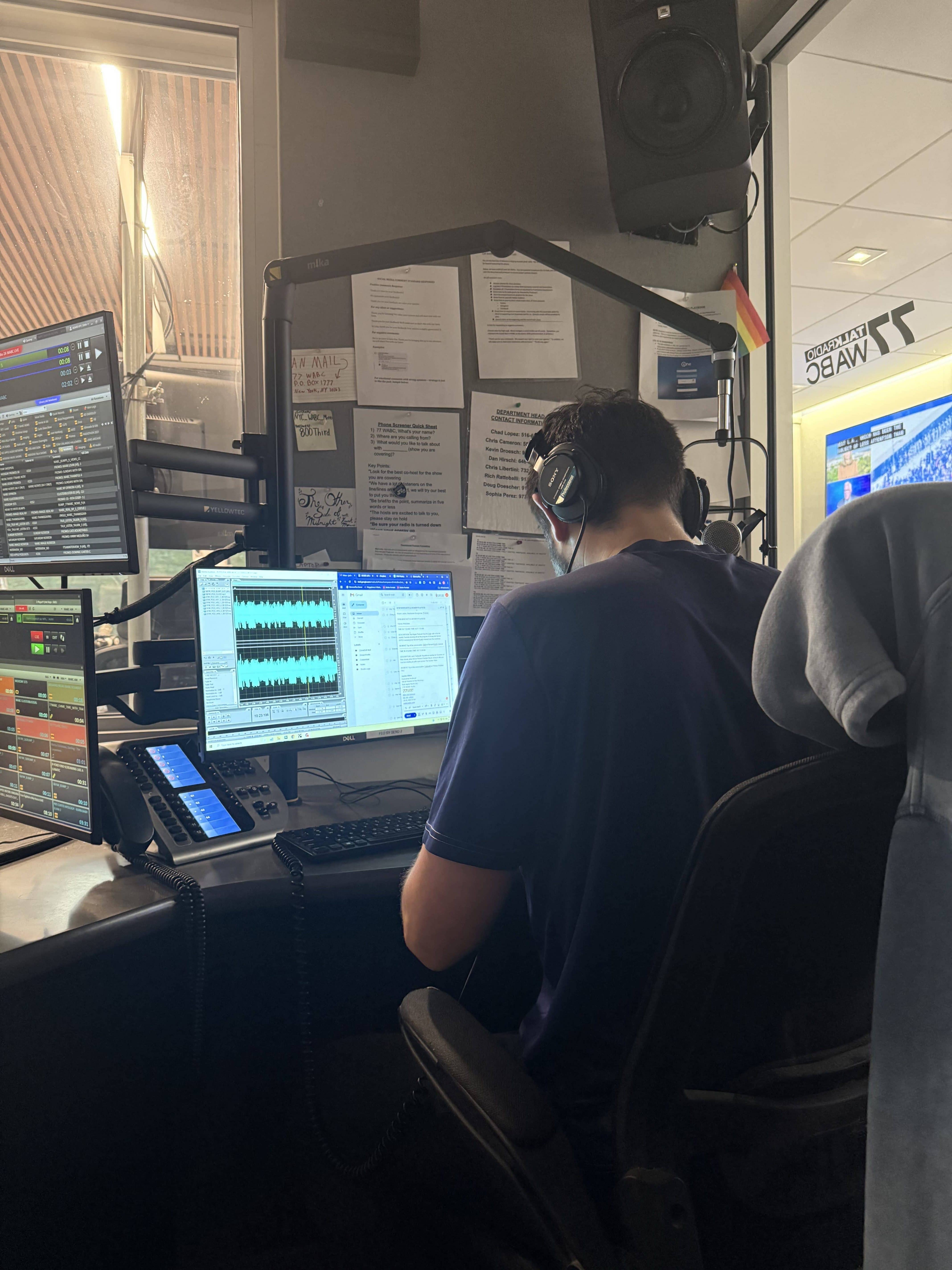 Board operator Lou Rufino in the foreground with Sid Rosenberg, in the studio, in the background. Summer 2025 at 77 WABC studios, New York, NY