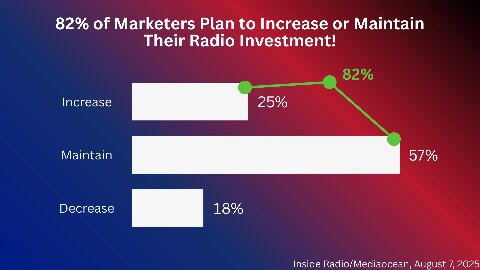 An impressive 82% of marketers plan to maintain or grow their radio advertising budgets in the second half of 2025, according to an Inside Radio article on a recent Mediaocean survey. The article states that one in four ad buyers expect to spend more on audio advertising during the second half of the year, while a majority of 57% plans to hold the line on what they have already allocated for 2025.