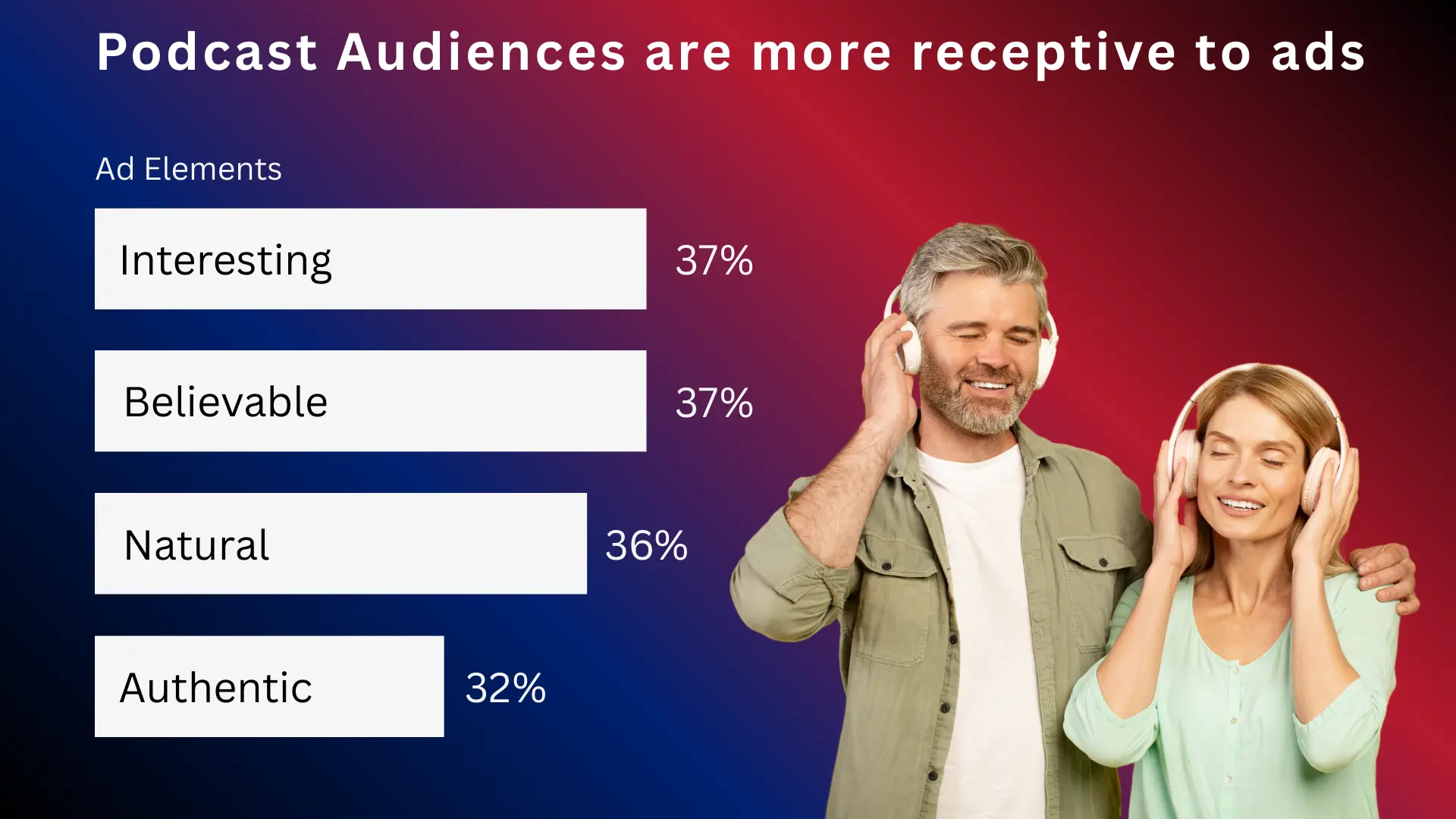 The Nielsen Podcasting Today report also confirms that podcast listeners, much like broadcast radio listeners, have an intimate and personal connection with the host. This makes host-read ads even more engaging, with an astounding 62% saying podcast hosts are “likable” and 42% rating them as “credible.