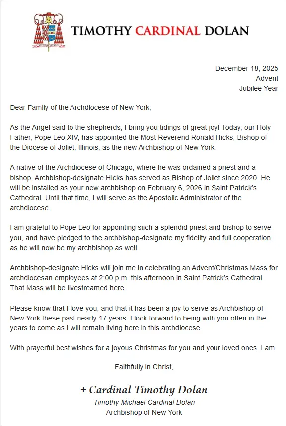 Now, Pope Leo has appointed Bishop Ronald Hicks, from his home state of Illinois, as the next Archbishop. Cardinal Tim Dolan has been a fixture in New York City life and its faith community for 16 years. He will be missed in that role, but remains busy planning for a Christmas Mass being held for archdiocesan employees, which is being live streamed at 2:00 pm.