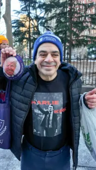 By early afternoon, the inauguration “block party” in the Financial District of Manhattan, was a test of endurance. Temperatures hovered around 26 degrees, after spending much of the day in the low 20s, with wind chill pushing conditions into what felt like the single digits. The pavement was slick with ice and salt. Supporters bounced in place, ran in circles, and did jumping jacks to stay warm as volunteers handed out Zohran Mamdani pins and attendees layered campaign gear over heavy winter coats. Chants repeatedly cut through the cold during speeches – “Zohran! Zohran! Zohran!” and “Tax the Rich!” – reinforcing the activist tone of the event.
