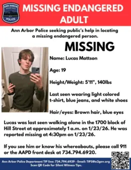 A nearly 20-hour search unfolded after Mattson was discovered missing, during bone-chilling cold. Local cops, the University of Michigan Division of Public Safety and Security, and the University of Michigan Police Department Drone Unit all took part in the effort. Eventually Mattson was found either Saturday night, or around noon Sunday, along Cambridge Road. Unable to survive the “extreme cold conditions,” Ann Arbor police also say “There were no signs of trauma and foul play is not suspected at this time.”