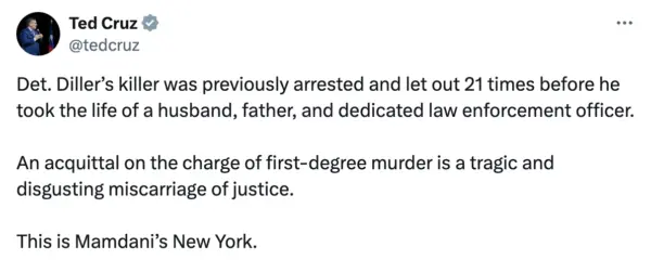 (New York, New York) – Lone Star State Senator Ted Cruz is weighing in following the death of an NYPD Detective. Cruz says the death of Det. Jonathan Diller could have been prevented if it wasn’t for the policies of New York City Mayor Zohran Mamdani.