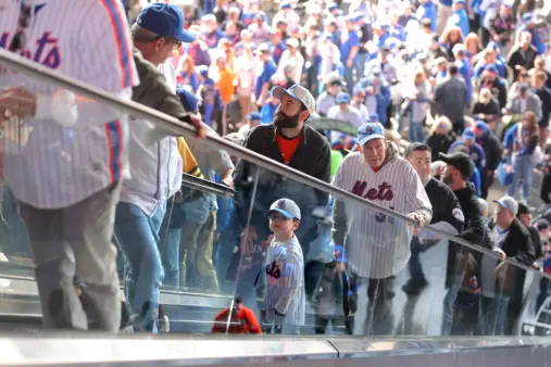 Mets fans ride the escalator in the Jackie Robinson rotunda on opening day 2026 against the Pittsburgh Pirates at Citi Field. Brad Penner-Imagn Images