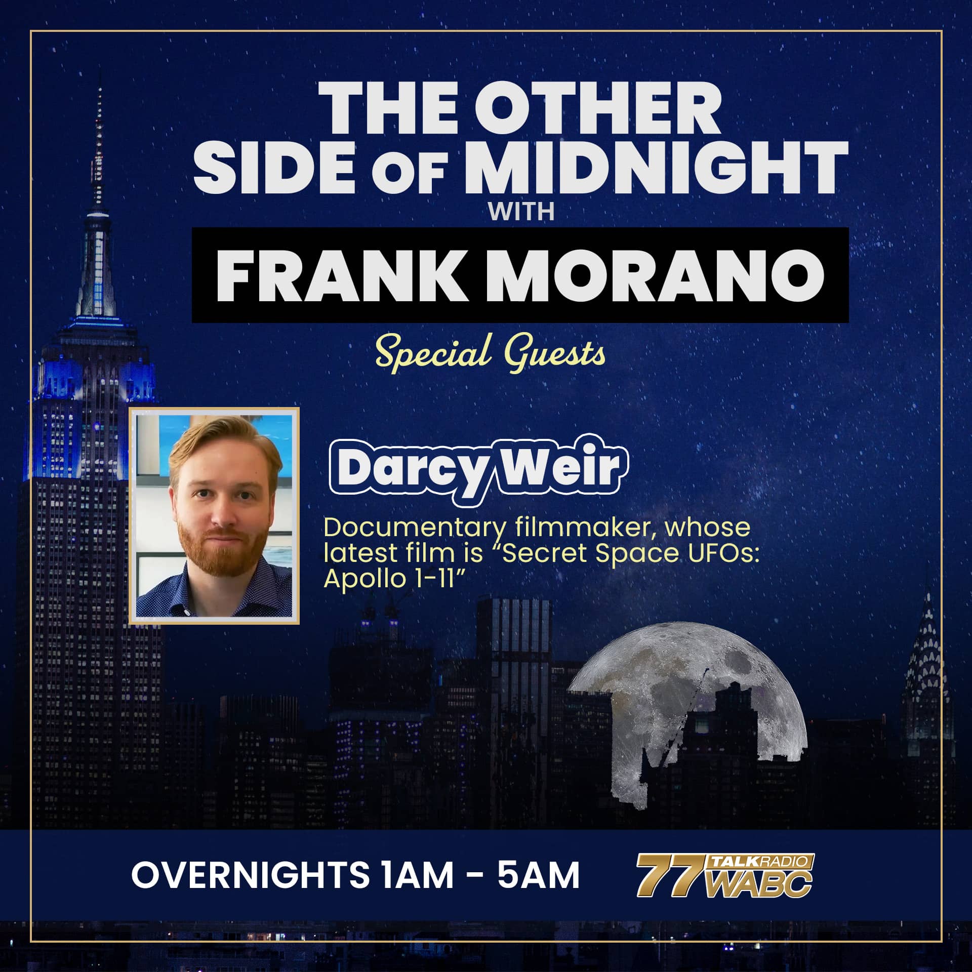 Frank interviews Darcy Weir, documentary filmmaker, whose latest film is “Secret Space UFOs: Apollo 1-11” and Mike Bara, New York Times Bestselling author, lecturer and TV personality about UFO sightings and the Apollo missions.